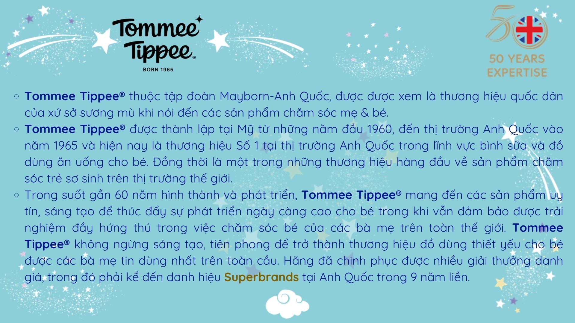 Tommee Tippee® thuộc tập đoàn Mayborn, được xem là thương hiệu quốc dân của Anh Quốc, là niềm tự hào của sứ xở sương mù khi nói đến các sản phẩm chăm sóc mẹ và bé.