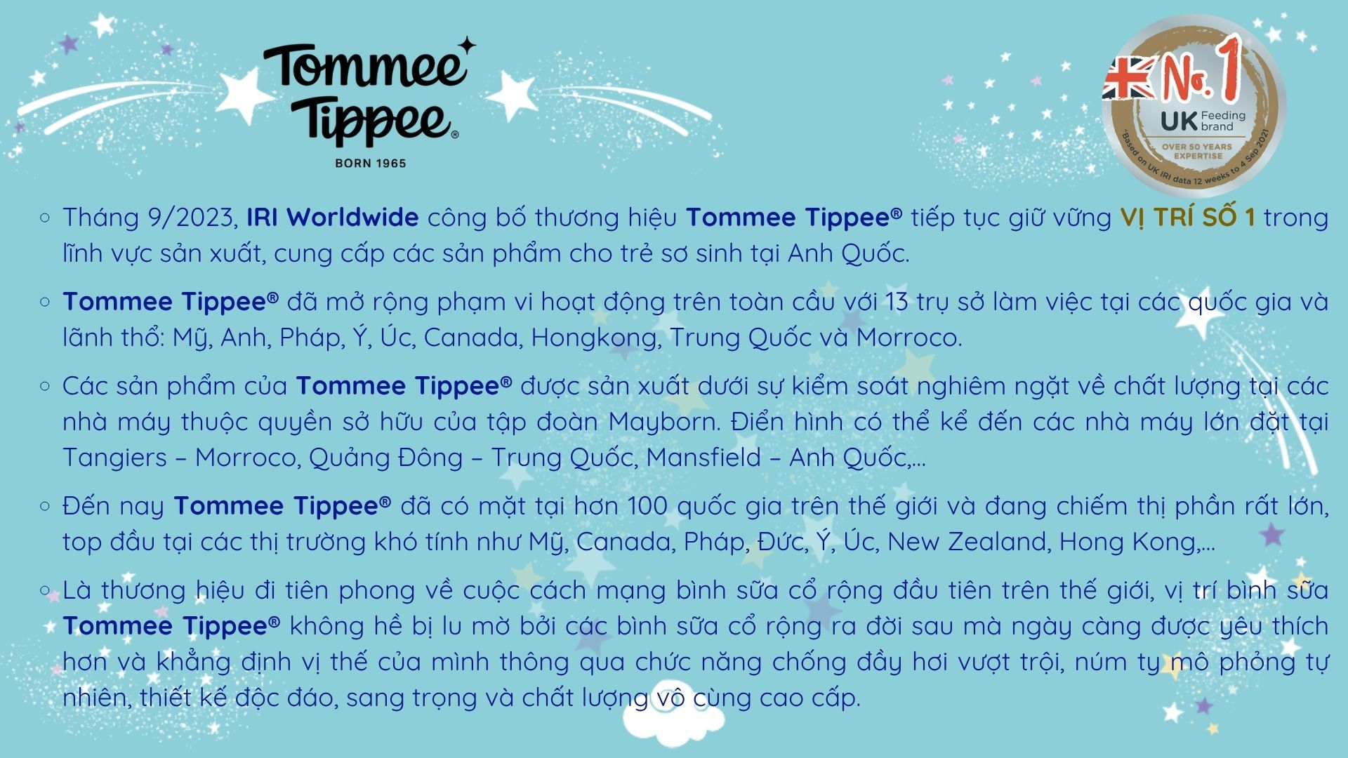 Tháng 9/2023, IRI Worldwide công bố thương hiệu Tommee Tippee® tiếp tục giữ vững VỊ TRÍ SỐ1 trong lĩnh vực sản xuất, cung cấp các sản phẩm cho trẻ sơ sinh tại Anh Quốc.