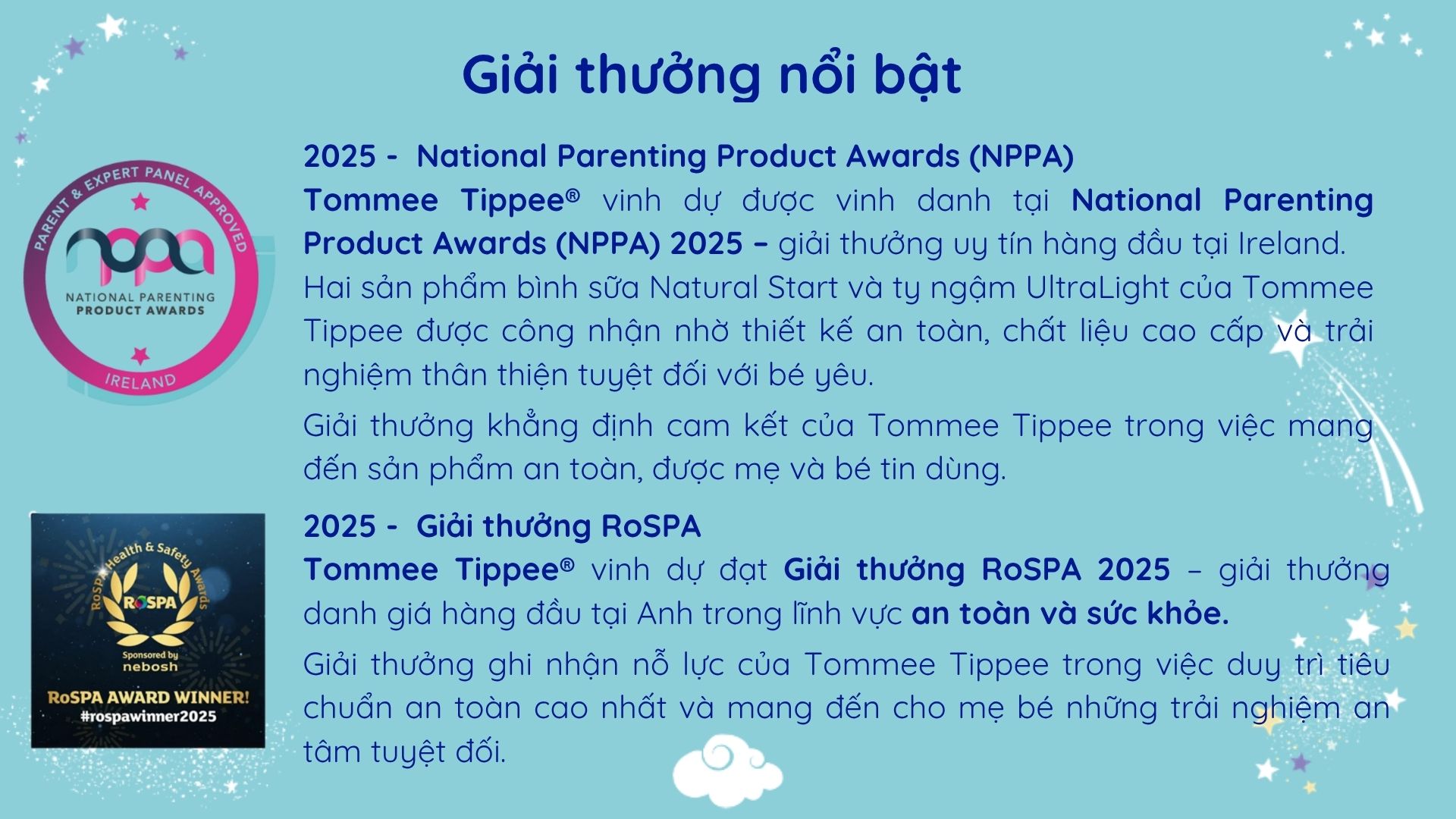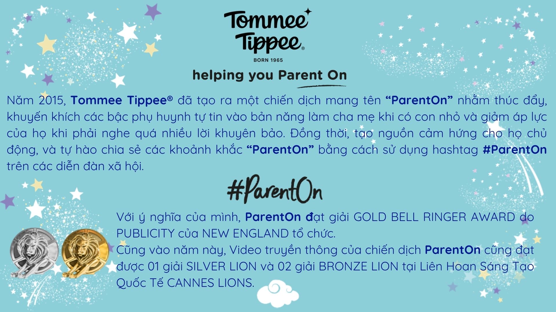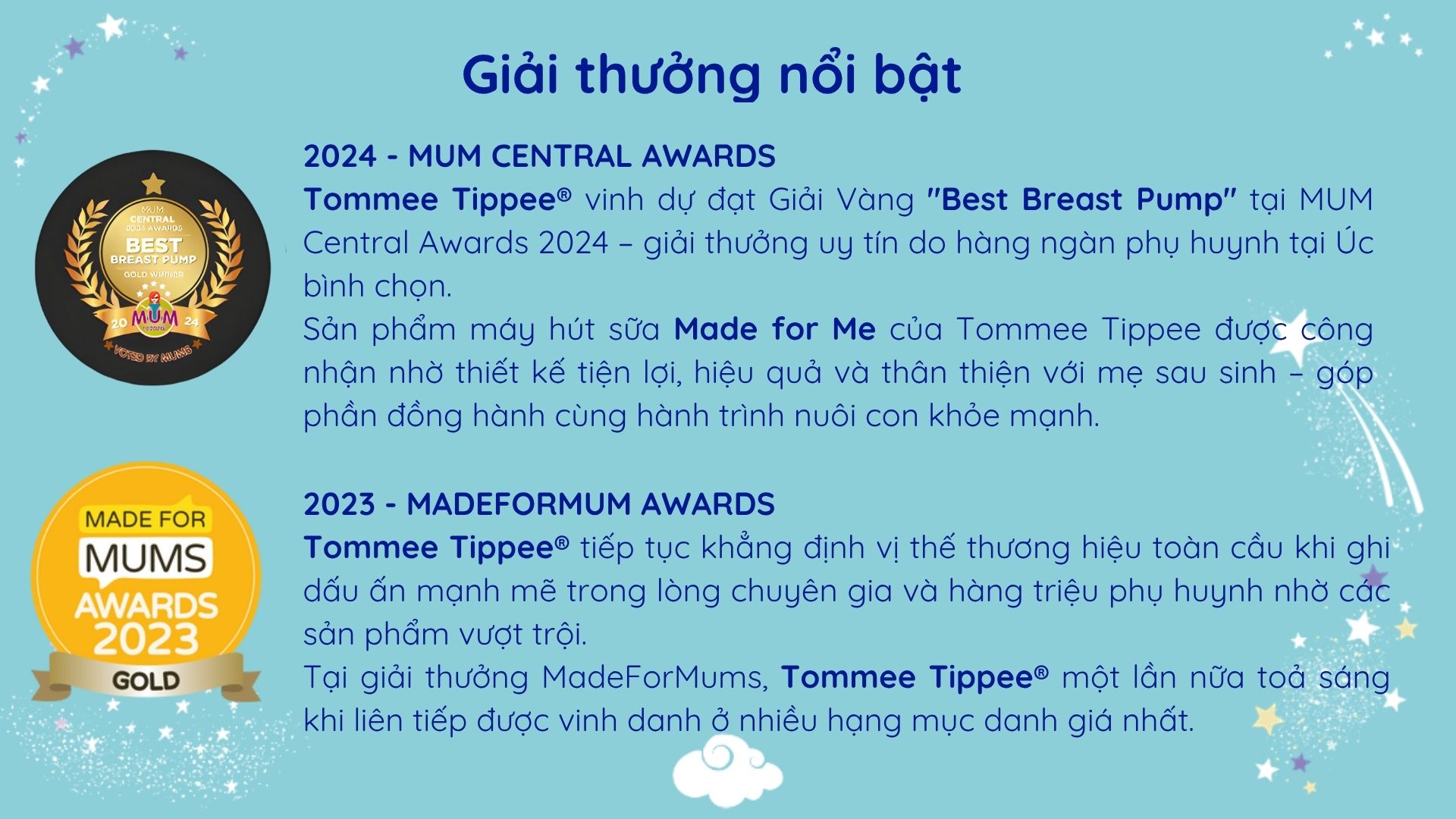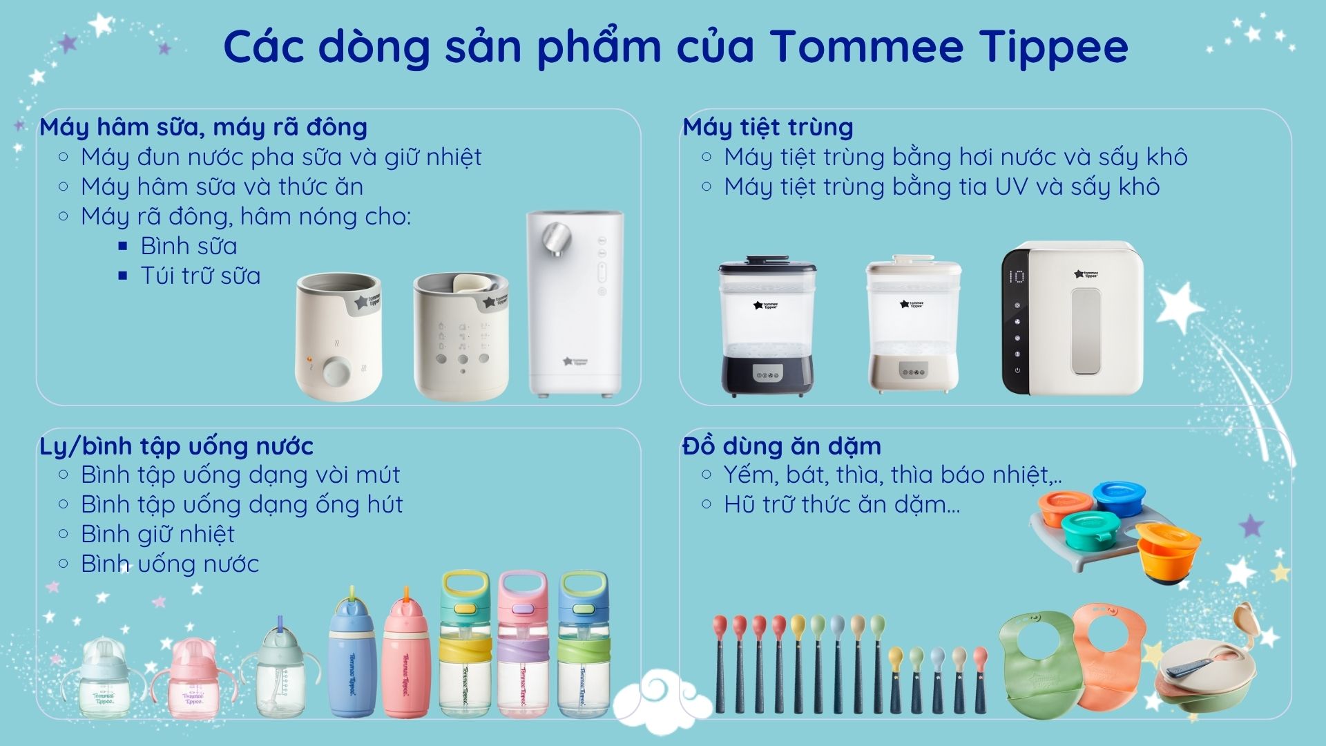 Tommee Tippee® mang đến các sản phẩm uy tín, sáng tạo để thúc đẩy sự phát triển ngày càng cao cho bé trong khi vẫn đảm bảo được trải nghiệm đầy hứng thú trong việc chăm sóc bé của các bà mẹ trên toàn thế giới. Tommee Tippee® không ngừng sáng tạo, tiên phong để trở thành thương hiệu đồ dùng thiết yếu cho bé được các bà mẹ tin dùng nhất trên toàn cầu. Hãng đã chinh phục được nhiều giải thưởng danh giá trong đó phải kể đến danh hiệu Superbrands tại Anh Quốc hơn 10 năm liền.