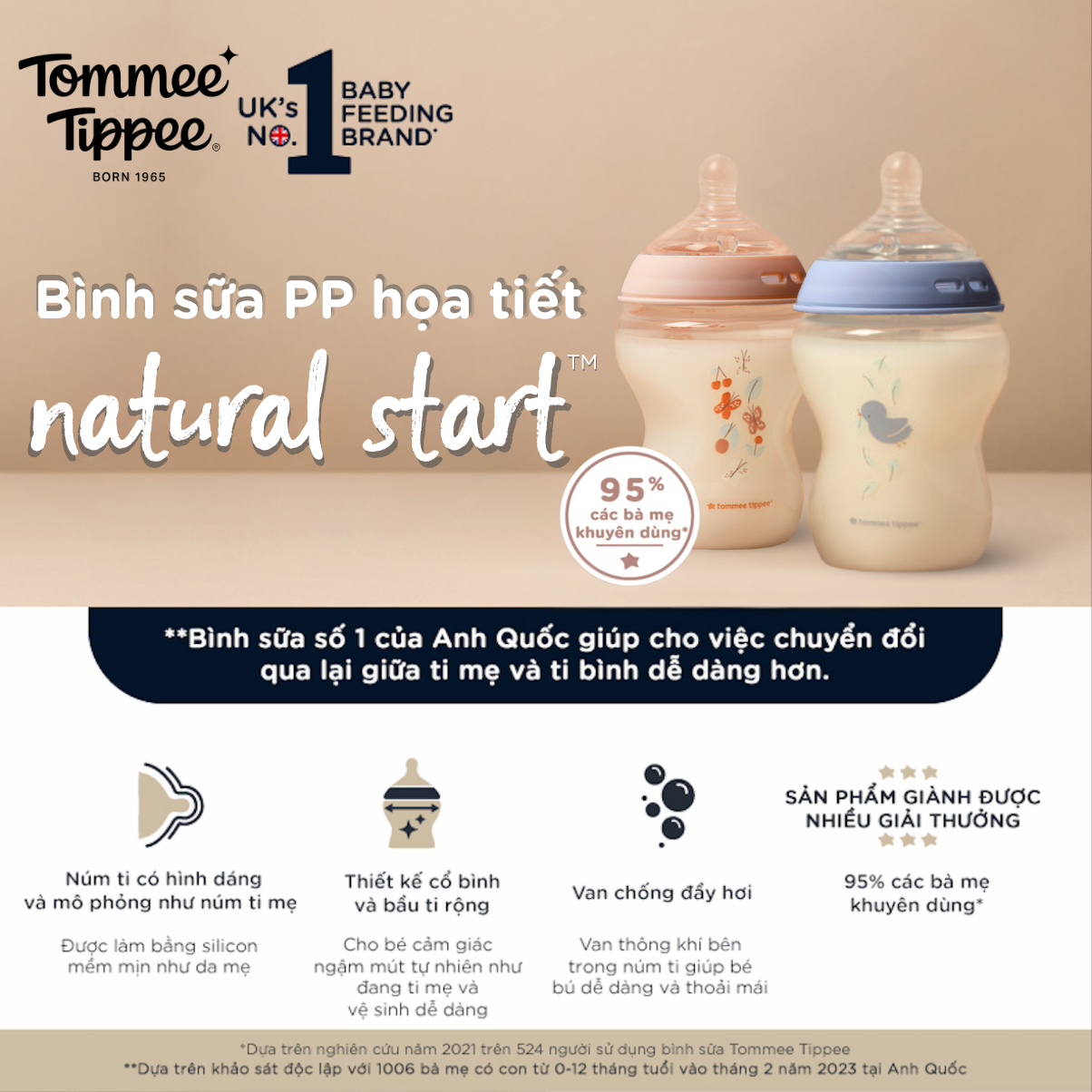 Bình sữa ty siêu mềm tự nhiên Tommee Tippee Natural Start giành được nhiều giải thưởng quốc tế, giúp việc kết hợp bú mẹ và bú bình chưa bao giờ đơn giản hơn. Van chống đầy hơi, chống sặc Easi-Vent vượt trội là đặc điểm nổi bật đã được kiểm chứng, đây sẽ là vật dụng tốt nhất cho bé của bạn.