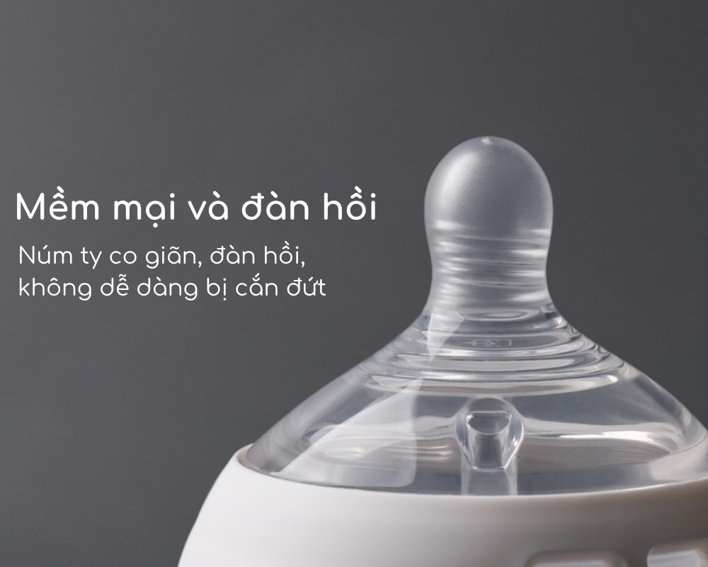 Núm ty mềm mịn như núm ty mẹ: núm ty làm bằng chất liệu silicon mềm mại, mô phỏng sự co dãn, đàn hồi của ty mẹ. Với cấu trúc đầu núm ty mềm mịn tạo cho bé cảm giác như làn da của ty mẹ, cho bé trải nghiệm như bú mẹ. Chất liệu silicon cao cấp không dễ bị cắn đứt.