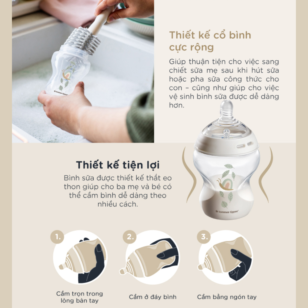 Hình dáng bình sữa thon gọn: được thiết kế để cầm ở các tư thế khác nhau một cách tự nhiên thoải mái nhất và chủ động nhất khi cho bé bú. Bé và bạn càng trở nên gần gũi, gắn kết hơn.