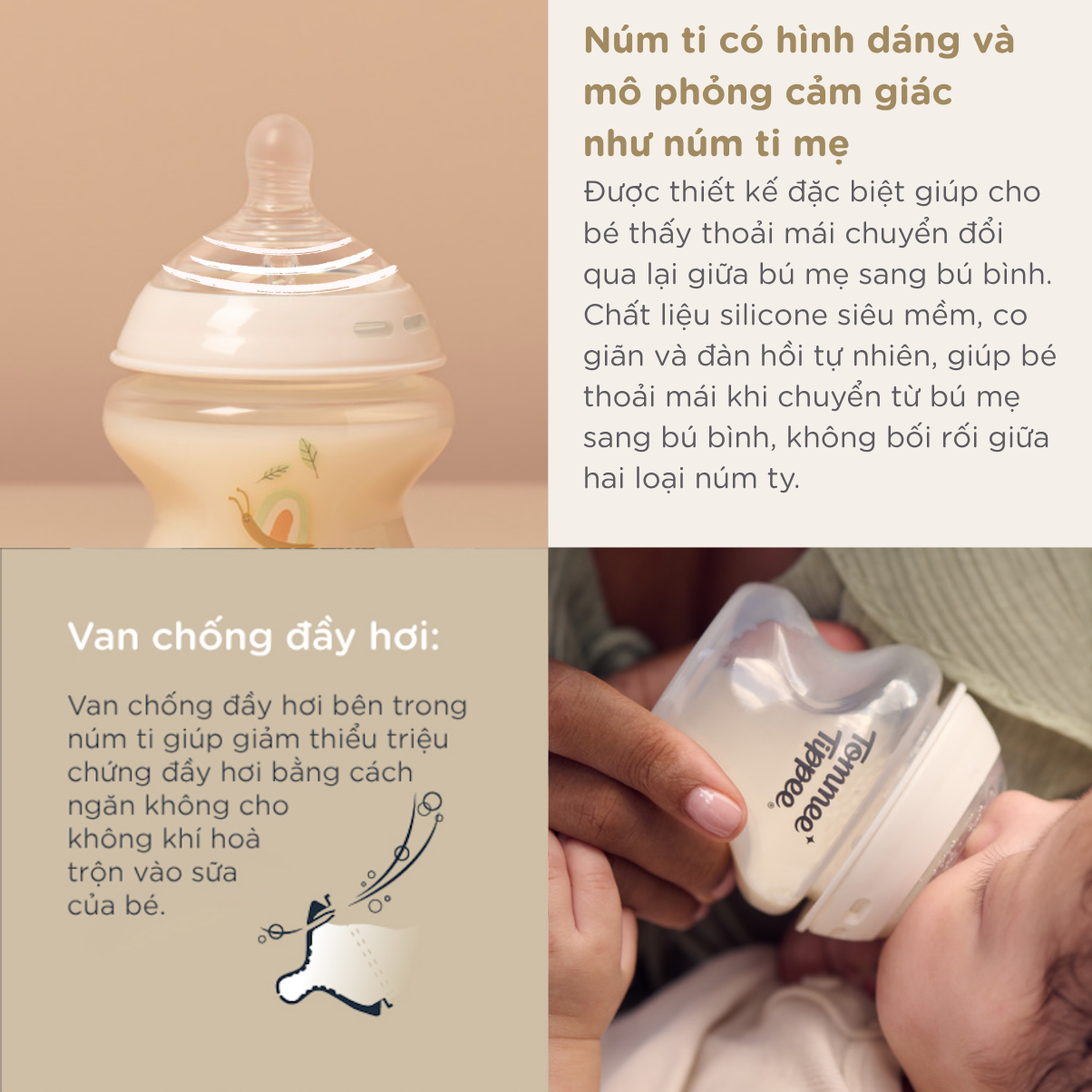 Núm ty và bầu ty bình sữa Tommee Tippee mô phỏng tự nhiên nhấtBầu ty rộng như bầu ngực mẹ: được thiết kế như hình dáng bầu ngực mẹ, mô phỏng sự mềm mại và chuyển động nhẹ nhàng tự nhiên của bầu ngực mẹ khi bé bú. Điều này giúp bé làm quen dễ dàng, dễ chấp nhận và hợp tác một cách tự nhiên, dễ dàng chuyển tiếp nhẹ nhàng từ ty mẹ sang ty bình.
