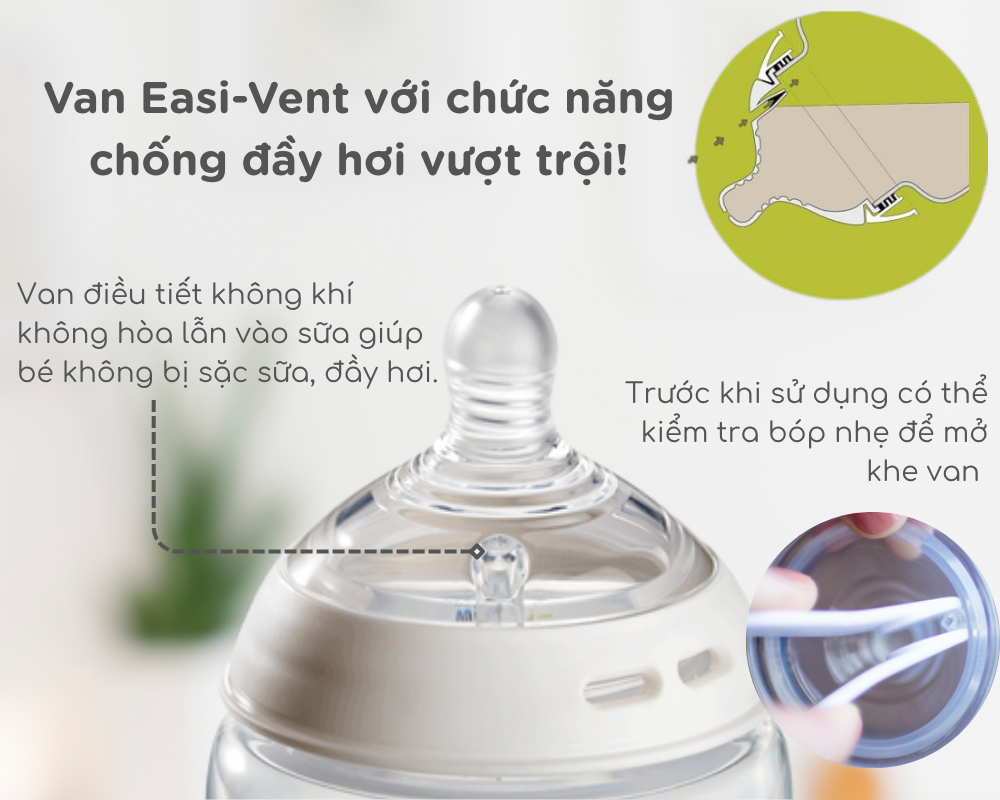 - Van Easi-Vent nằm trên núm ty có chức năng thông khí chống sặc, chống đầy hơi cực kỳ hiệu quả đã được kiểm chứng. Van hoạt động nhạy bén, ngăn chặn bọt khí hòa trong sữa, giúp bé tránh bị đầy hơi, sặc sữa.