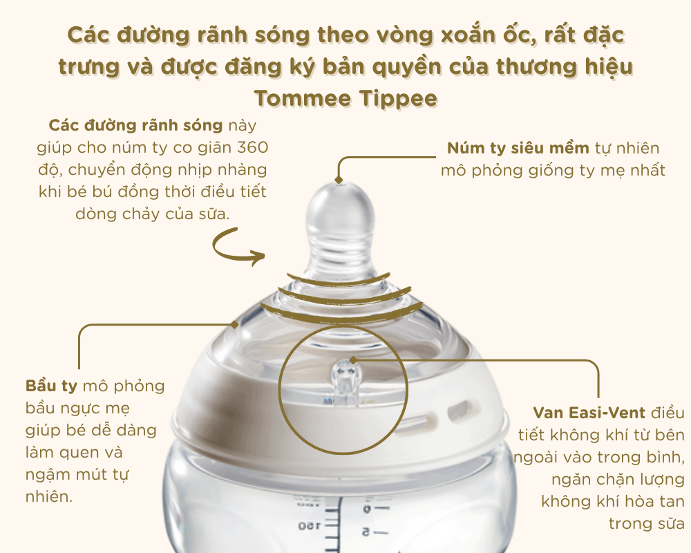 Van Easi-Vent chống sặc, chống đầy hơi hiệu quả, giảm thiểu tình trạng sặc sữa ở bé- Rãnh sóng theo vòng xoắn ốc: Phía bên mặt trong của núm ty có các đường rãnh sóng theo vòng xoắn ốc, rất đặc trưng và được đăng ký bản quyền của thương hiệu Tommee Tippee. Các đường rãnh sóng này giúp cho núm ty co giãn 360 độ, chuyển động nhịp nhàng khi bé bú đồng thời điều tiết dòng chảy của sữa, lưu thông dòng sữa theo lực hút của bé, sữa sẽ không chạy ra ồ ạt hay xáo trộn gây ra tình trạng sặc sữa ở bé. Đây chính là sự vượt trội của núm ty Tommee Tippee so với các núm ty khác trên thị trường về mặt phát triển sản phẩm gần với tự nhiên nhất.