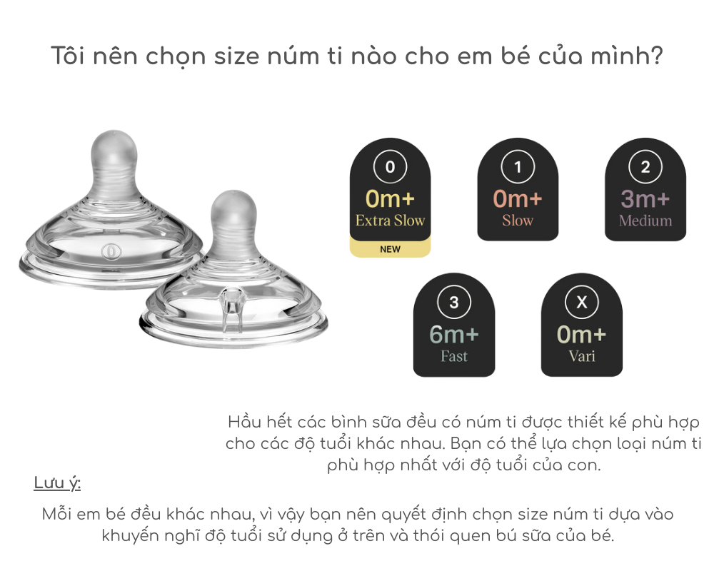 Ở mỗi giai đoạn phát triển của bé, bé sẽ có nhu cầu sử dụng các loại núm ty theo các kích cỡ khác nhau. Khi bé lớn dần lên thì lực bú của bé càng tốt hơn, nhanh hơn, mạnh hơn và cần nhiều lượng sữa hơn do đó đây cũng là lúc mẹ cần đổi kích cỡ bình sữa và núm ty đáp ứng khả năng bú nhanh và khỏe hơn của bé.