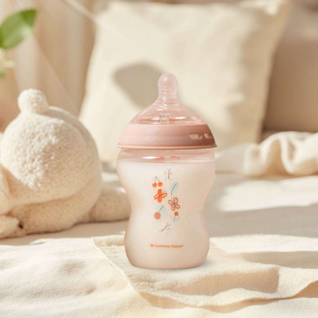 Tên sản phẩm: Bình sữa ty siêu mềm tự nhiên Tommee Tippee Natural Start 260ml hoạ tiết (bình đôi) – Hồng, núm ty của bình 3-6 tháng