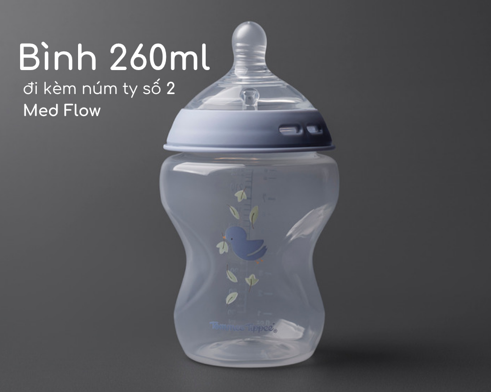 Tên sản phẩm: Bình sữa ty siêu mềm tự nhiên Tommee Tippee Natural Start 260ml hoạ tiết (bình đôi) – Xanh Dương, núm ty của bình 3-6 tháng
