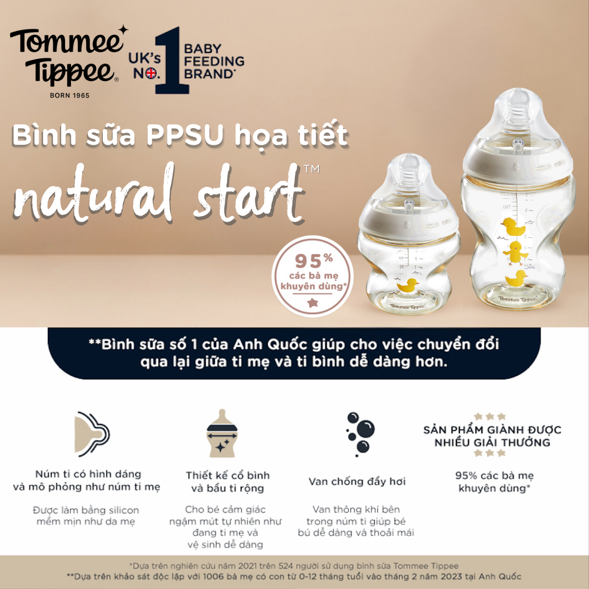 Bình Sữa PPSU Ty Siêu Mềm Tự Nhiên Tommee Tippee Natural Start 150ml, Núm Ty Của Bình 0-3 Tháng, Họa Tiết Vàng 445.000 VNĐ