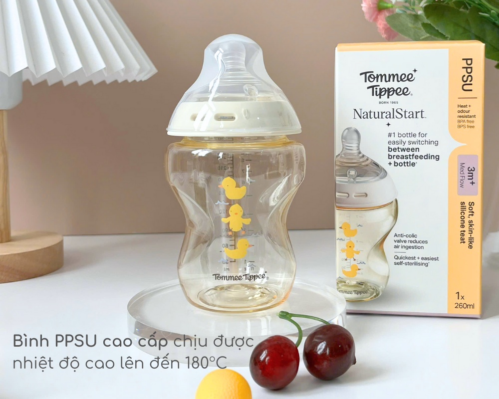 PPSU là chất liệu không chứa hóa chất, chống bám mùi, chống trầy xước và bám bẩn, sử dụng bền lâu và rất dễ cọ rửa làm sạch, do đó đây là vật liệu lý tưởng để làm bình sữa. Giống như tất cả các dòng bình sữa Natural Start khác của Tommee Tippee, bình sữa PPSU có núm ty siêu mềm tự nhiên, mô phỏng tự nhiên nhất từ xưa đến nay, co dãn đàn hồi và mềm mịn tạo cảm giác như ty mẹ, giúp cho việc chuyển đổi giữa bú mẹ và bú bình trở thành một trải nghiệm thoải mái, không còn lo lắng điều gì.