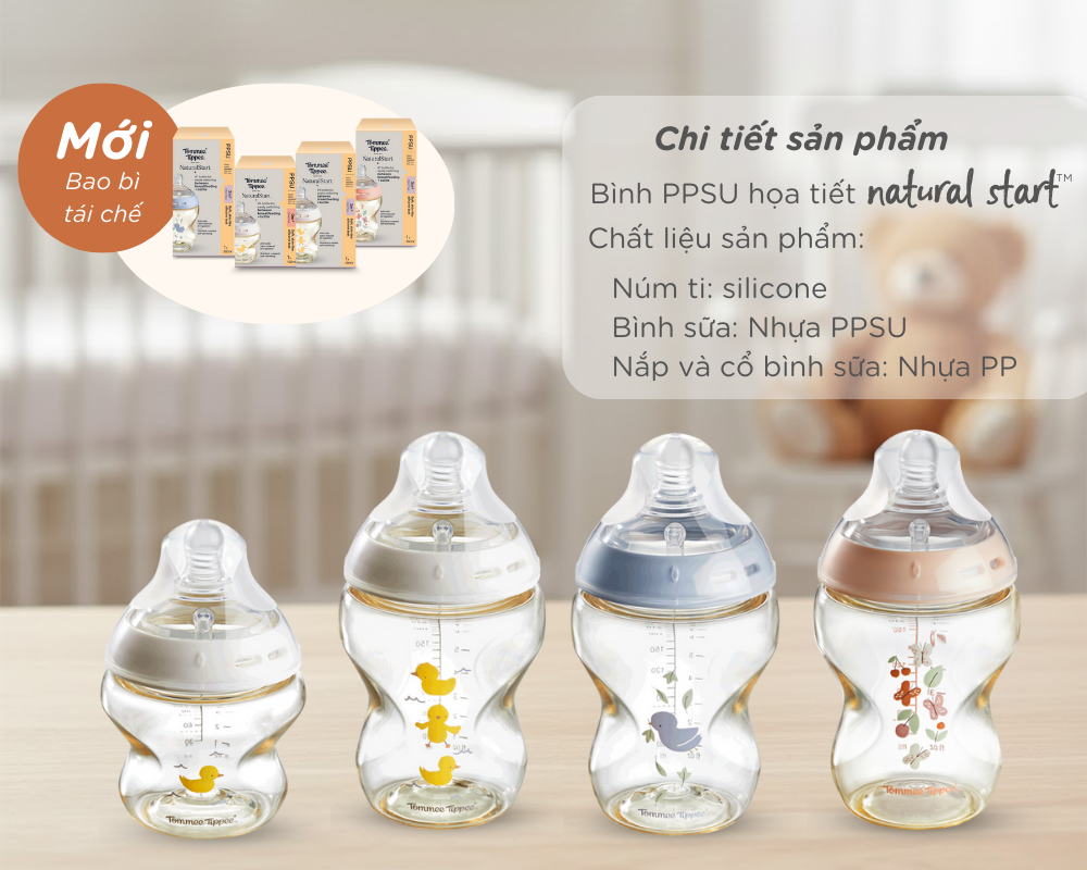 Tên sản phẩm: Bình sữa PPSU ty siêu mềm tự nhiên Tommee Tippee Natural Start 260ml hoạ tiết, núm ty dành cho bé từ 3 đến 6 tháng